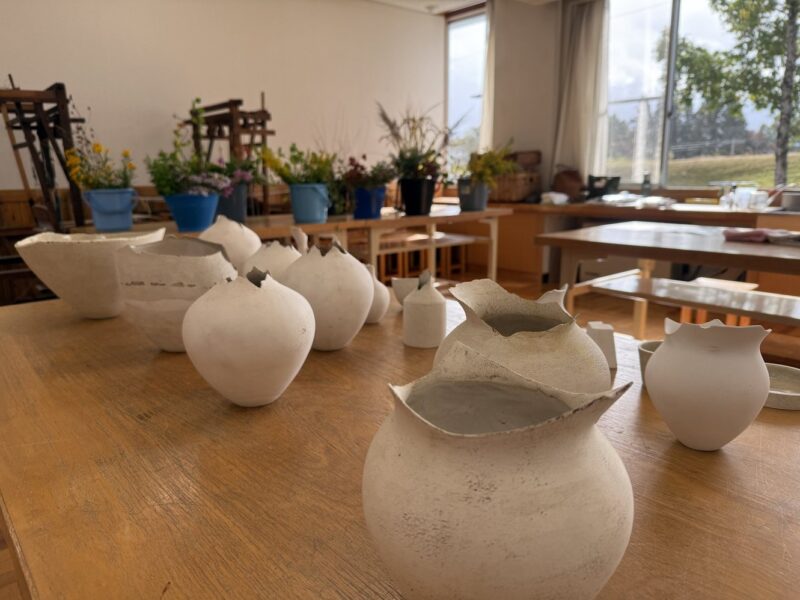 ㉔花生けに用意された花器は、町内の陶芸家の方の作品です。個性的な口縁が印象的ですが、どんな草花とも静かに調和する佇まいからは「枯淡の趣」という言葉が思い浮かびます。