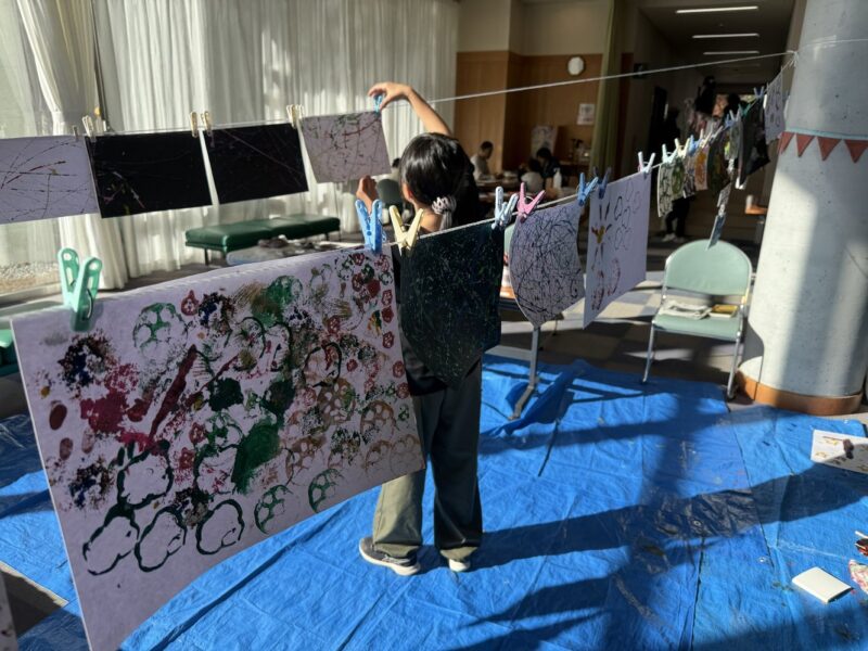 ⑦絵のブースでは町内の保育士さんたちが野菜を使った体験を用意してくださいました。途中、雨のハプニングもありましたが、ロビーの即席展覧会は壮観でした。