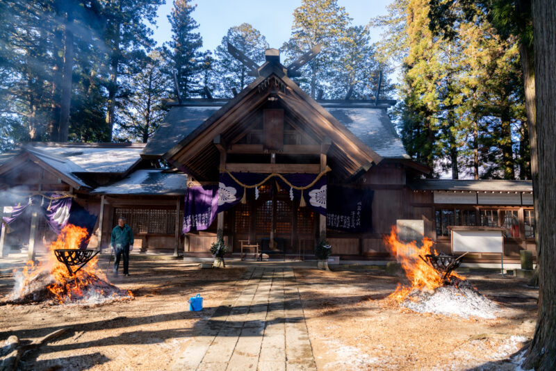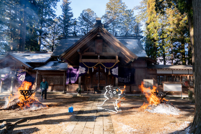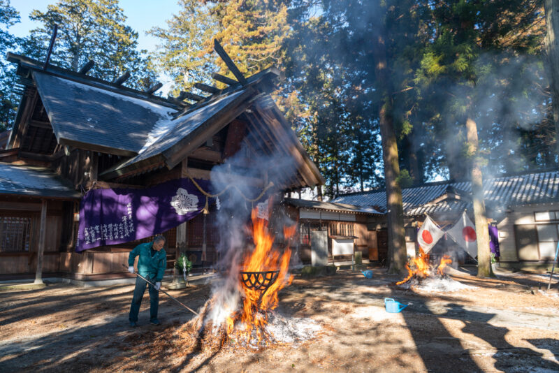 神社の入り口は昨夜の雪が積もっていましたが、大きな木に囲まれた境内には雪はほとんどありませんでした。しかし、大風により大量の葉が落ちたようで、関係者の方々が掃除をした葉っぱで焚き火をしていました。