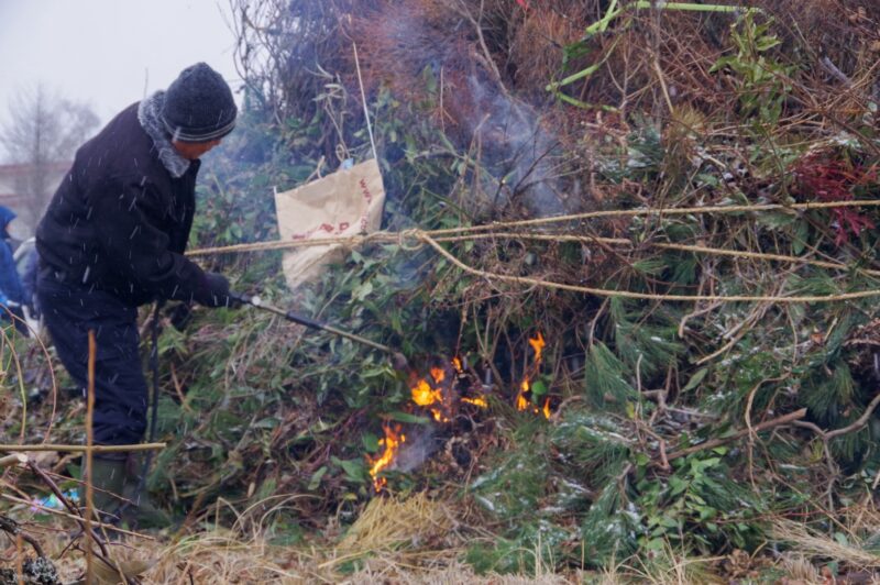 14時頃の火入れ前からは地域の方々が集まり、お菓子やお酒を囲みながら、楽しそうに語り合う姿が印象的でした。