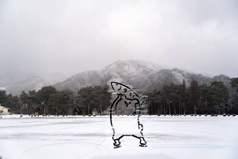 一面凍った城ヶ池ですが、30年ほど前はスケートリンクになり、町民がスケートを楽しんでいたそうです。